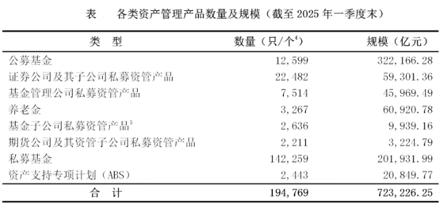 中国基金业协会最新发布的数据显示,截至2025年一季度末,基金管理公司及其子公司、证券公司及其子公司、期货公司及其资管子公司、私募基金管理机构资产管理产品总规模达72.32万亿元。